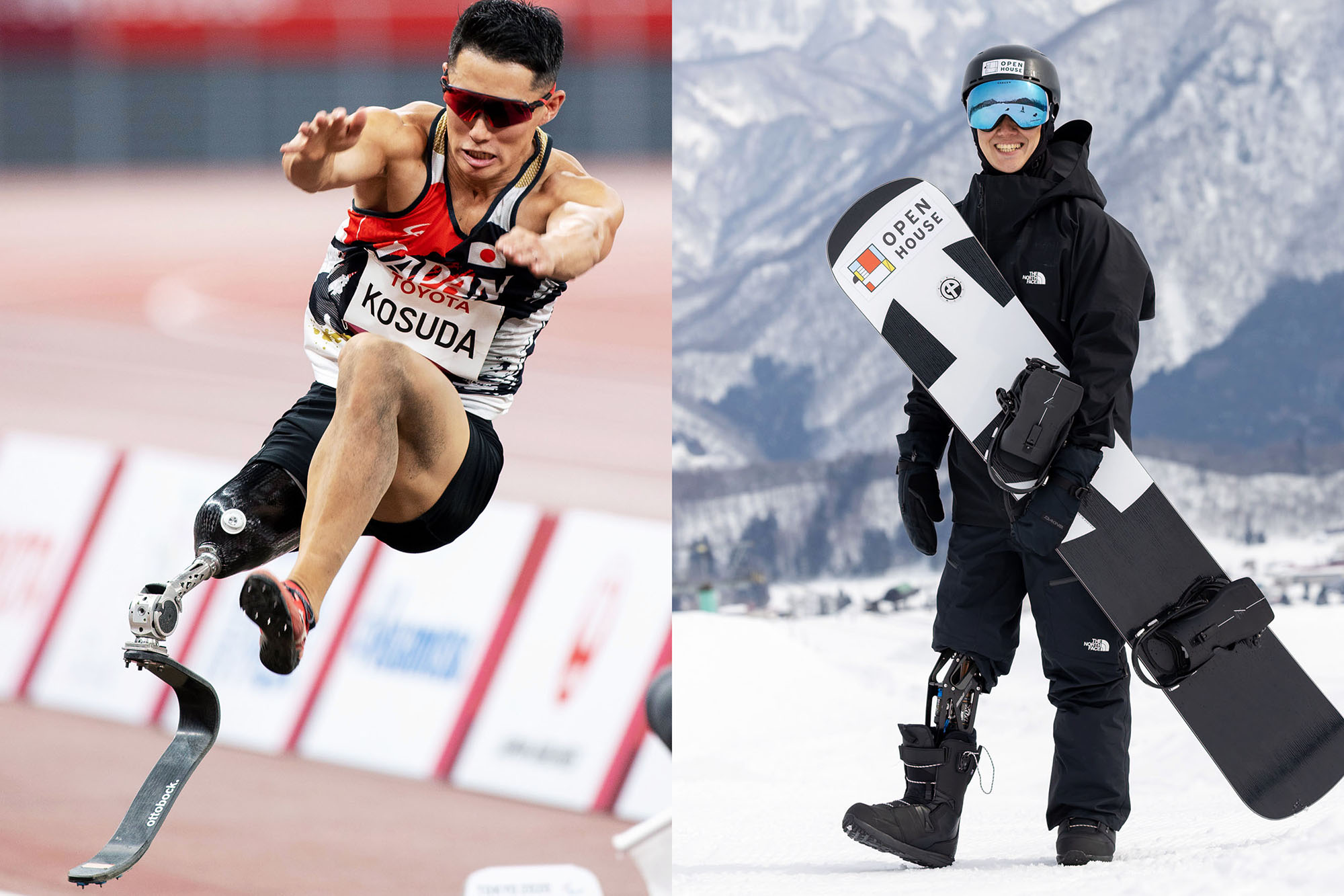 夏冬2大会のパラリンピックに出場してきた小須田潤太選手。左は東京2020パラリンピック、右はパラスノーボードでの姿(撮影:越智貴雄)